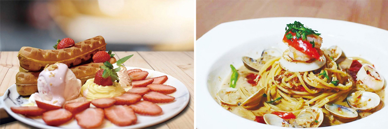 ▲(左)草莓卡士達鬆餅250元;(右)泰式海鮮義大利麵270元。