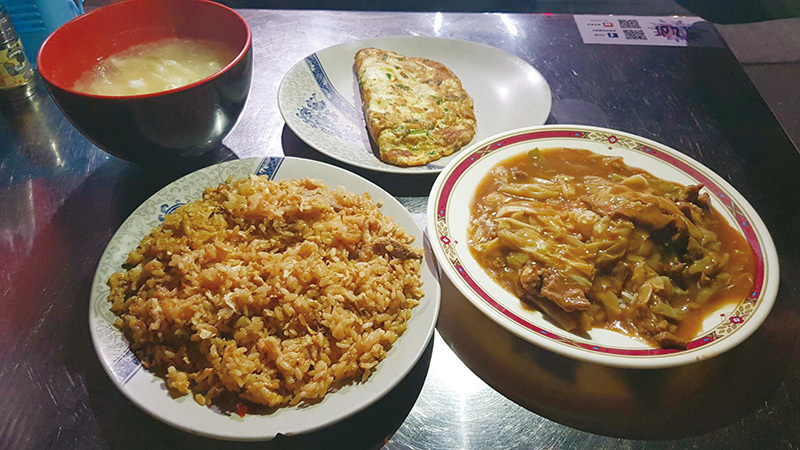 ▲XO什錦炒飯100元(左)、牛肉燴飯80元(右)、蔥花蛋70元(後)
