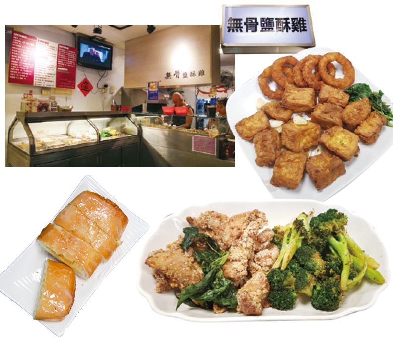 ▲(右上)雞蛋豆腐50元、洋蔥圈35元/冷掉都好吃,蒜片也給的超大方。(右下)無骨鹽酥雞45元、醬汁青花菜40元/招牌必點。(左下)銀絲卷(煉乳)30元。