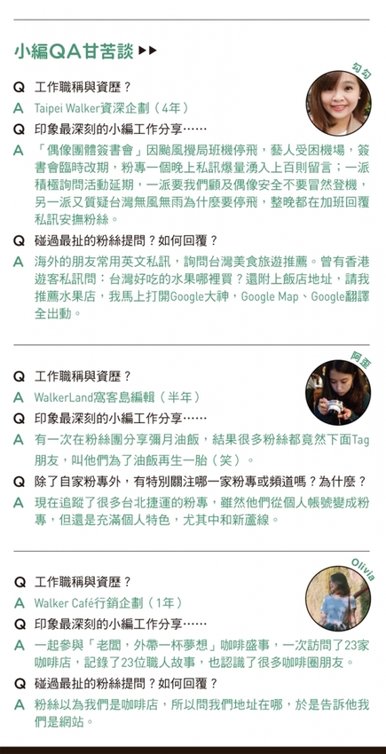 今年將邁入20周年的台灣角川,旗下的《Taipei Walker》、《WalkerLand窩客島》與《Walker Café》一直以來提供最即時、有趣的美食旅遊資訊給讀者,站在第一線的小編們更是要機伶,面對天外飛來一筆的粉絲需求才能順利接招!