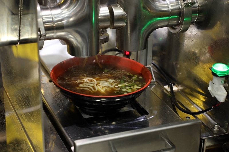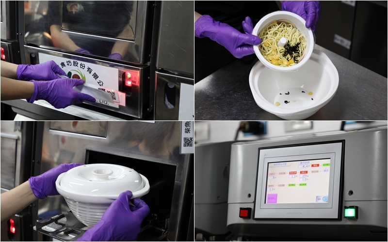 走進廚房內不見鍋爐設備,唯有數台AI蒸煮機器人,將煮過再冷凍的麵條放入特製不燙手的拉麵碗中,以掃QRCODE的方式,讓機器人透過蒸氣高溫加熱,40秒後就能端出如廚師自製般完美的拉麵。AI蒸煮機器人帶來的不只是美味,還有節省下的人力。